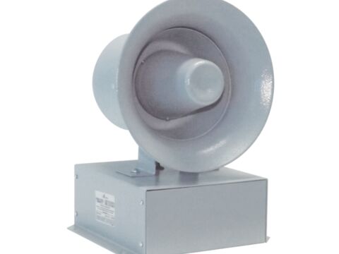 Sirene ideal para locais abertos, com longo alcance. Pode ser instalada em galpões, garagens de ônibus e etc